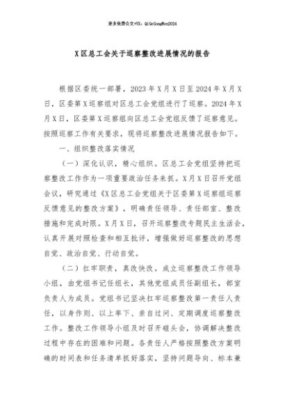 / 【七哥公文】2024年:X区总工会关于巡察整改进展情况的报告+更多免费公文+VX:QiGeGongWen2024