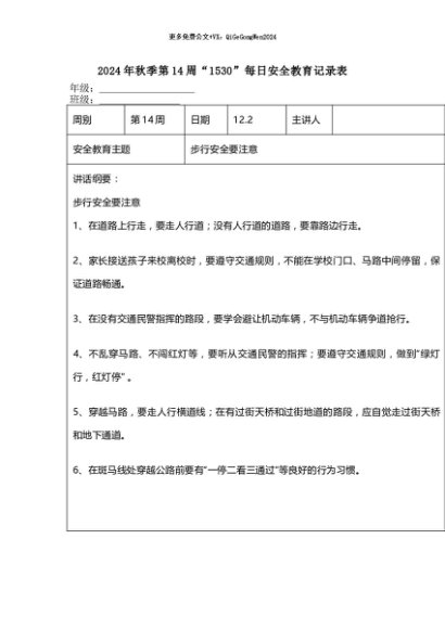 【七哥公文】2024年:2024年秋季第14周“1530”每日安全教育记录表+更多免费公文+VX:QiGeGongWen2024