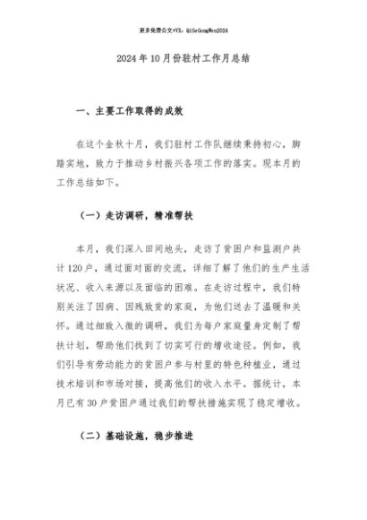 / 【七哥公文】2024年:2024年10月份驻村工作月总结+更多免费公文+VX:QiGeGongWen2024