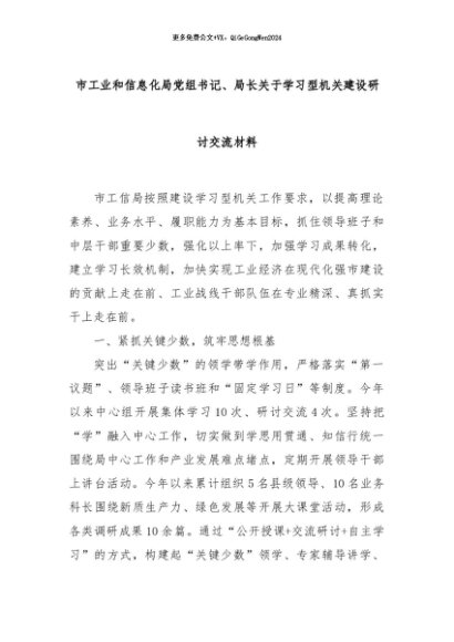 【七哥公文】2024年:市工业和信息化局党组书记、局长关于学习型机关建设研讨交流材料+更多免费公文+VX:QiGeGongWen2024