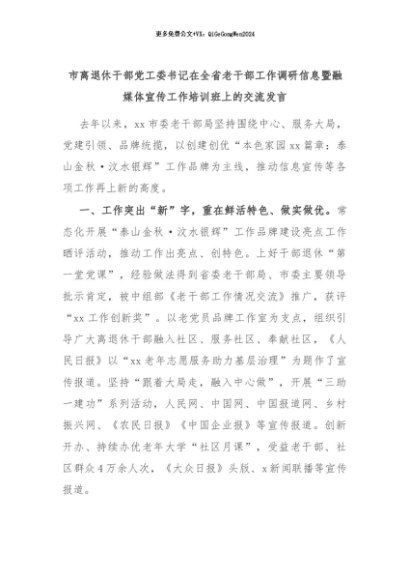 【七哥公文】2024年:市离退休干部党工委书记在全省老干部工作调研信息暨融媒体宣传工作培训班上的交流发言+更多免费公文+VX:QiGeGongWen2024