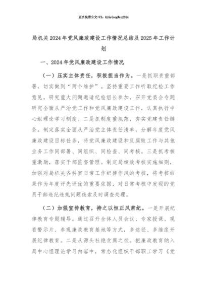 【七哥公文】2024年:局机关2024年党风廉政建设工作情况总结及2025年工作计划+更多免费公文+VX:QiGeGongWen2024