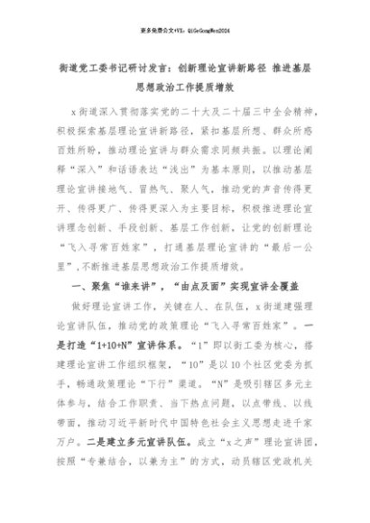 【七哥公文】2024年:街道党工委书记研讨发言:创新理论宣讲新路径 推进基层思想政治工作提质增效+更多免费公文+VX:QiGeGongWen2024