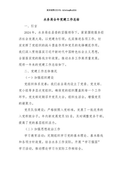 / 【七哥公文】2024年:水务局全年党建工作总结+更多免费公文+VX:QiGeGongWen2024