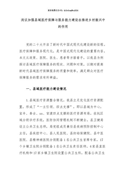 【七哥公文】2024年:浅议加强县域医疗保障与服务能力建设在推进乡村振兴中的作用+更多免费公文+VX:QiGeGongWen2024