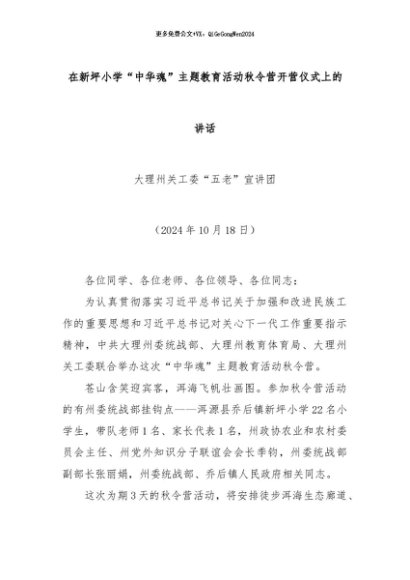 【七哥公文】2024年:在新坪小学“中华魂”主题教育活动秋令营开营仪式上的讲话+更多免费公文+VX:QiGeGongWen2024