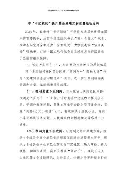 / 【七哥公文】2024年:市“书记领航”提升基层党建工作质量经验材料+更多免费公文+VX:QiGeGongWen2024