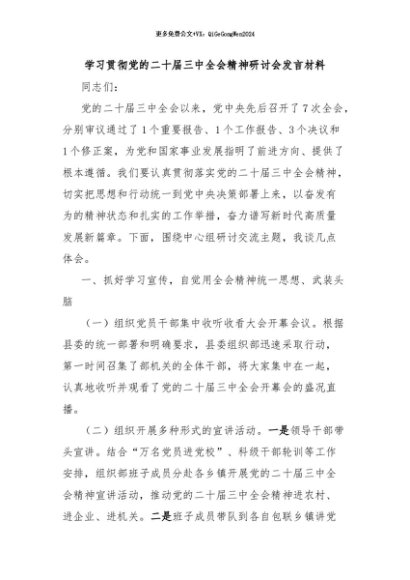/ 【七哥公文】2024年:学习贯彻党的二十届三中全会精神研讨会发言材料+更多免费公文+VX:QiGeGongWen2024