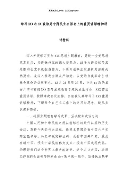 【七哥公文】2024年:学习XXX在XX政治局专题民主生活会上的重要讲话精神研讨材料+更多免费公文+VX:QiGeGongWen2024