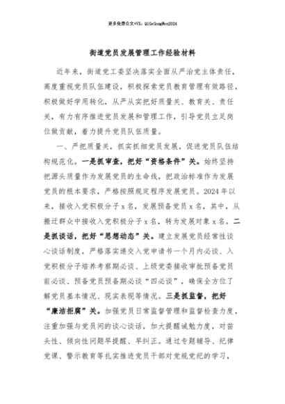 / 【七哥公文】2024年:街道党员发展管理工作经验材料+更多免费公文+VX:QiGeGongWen2024