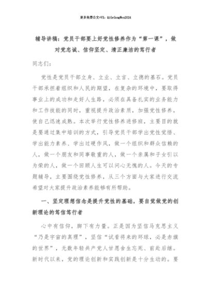 【七哥公文】2024年:辅导讲稿:党员干部要上好党性修养作为“第一课”,做对党忠诚、信仰坚定、清正廉洁的笃行者+更多免费公文+VX:QiGeGongWen2024