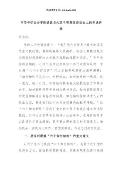 【七哥公文】2024年:市委书记在全市新提拔县处级干部集体谈话会上的党课讲稿+更多免费公文+VX:QiGeGongWen2024