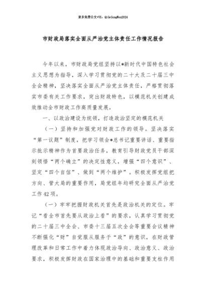 / 【七哥公文】2024年:市财政局落实全面从严治党主体责任工作情况报告+更多免费公文+VX:QiGeGongWen2024