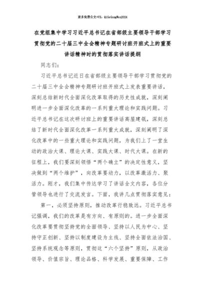【七哥公文】2024年:在党组集中学习习近平总书记在省部级主要领导干部学习贯彻党的二十届三中全会精神专题研讨班开班式上的重要讲话精神时的贯彻落实讲话提纲+更多免费公文+VX:QiGeGongWen2024