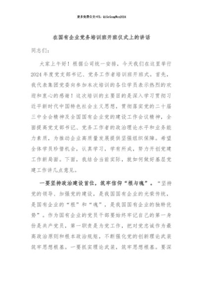 / 【七哥公文】2024年:在国有企业党务培训班开班仪式上的讲话+更多免费公文+VX:QiGeGongWen2024