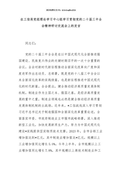 【七哥公文】2024年:在工信局党组理论学习中心组学习贯彻党的二十届三中全会精神研讨交流会上的发言+更多免费公文+VX:QiGeGongWen2024