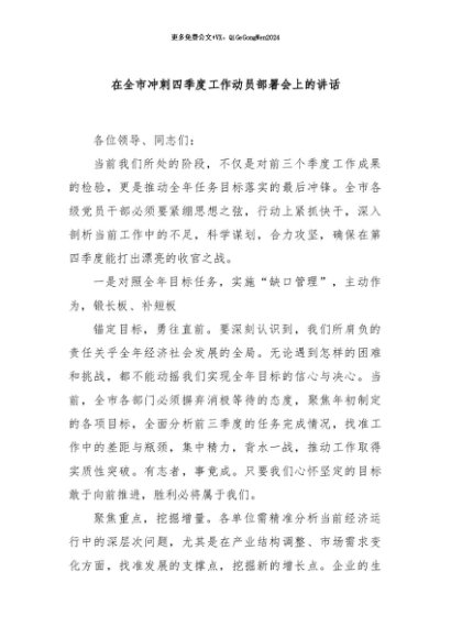 / 【七哥公文】2024年:在全市冲刺四季度工作动员部署会上的讲话+更多免费公文+VX:QiGeGongWen2024