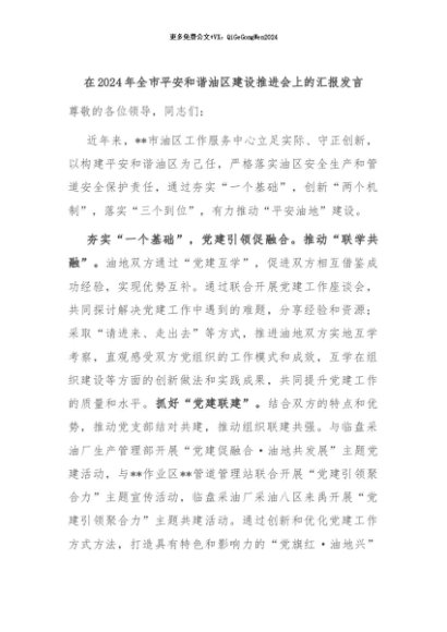 【七哥公文】2024年:在2024年全市平安和谐油区建设推进会上的汇报发言+更多免费公文+VX:QiGeGongWen2024
