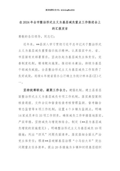 【七哥公文】2024年:在2024年全市整治形式主义为基层减负重点工作推进会上的汇报发言+更多免费公文+VX:QiGeGongWen2024