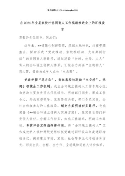 【七哥公文】2024年:在2024年全县家校社协同育人工作现场推进会上的汇报发言+更多免费公文+VX:QiGeGongWen2024