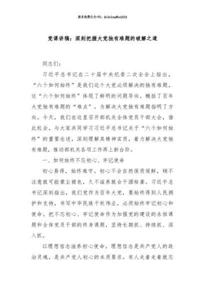 / 【七哥公文】2024年:党课讲稿:深刻把握大党独有难题的破解之道+更多免费公文+VX:QiGeGongWen2024