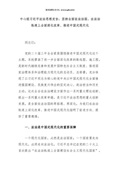 【七哥公文】2024年:中心组习近平法治思想发言:坚持全面依法治国,在法治轨道上全面深化改革、推进中国式现代化+更多免费公文+VX:QiGeGongWen2024