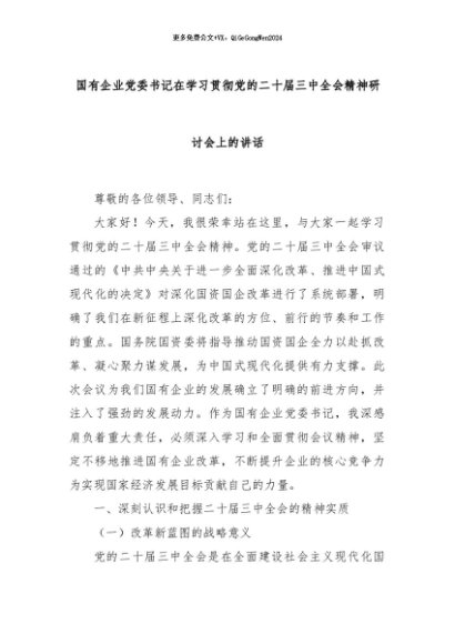 【七哥公文】2024年:国有企业党委书记在学习贯彻党的二十届三中全会精神研讨会上的讲话+更多免费公文+VX:QiGeGongWen2024
