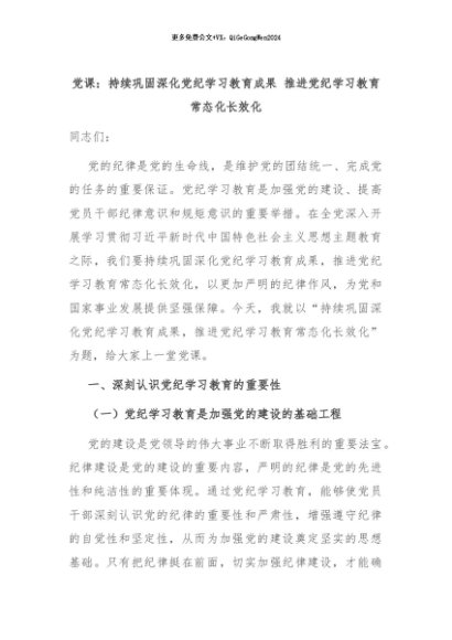 【七哥公文】2024年:党课:持续巩固深化党纪学习教育成果 推进党纪学习教育常态化长效化+更多免费公文+VX:QiGeGongWen2024