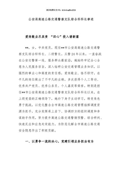 / 【七哥公文】2024年:公安局高速公路交通警察支队综合科科长事迹+更多免费公文+VX:QiGeGongWen2024
