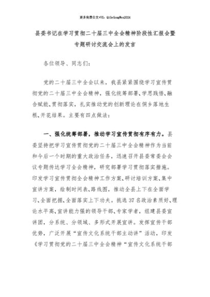 【七哥公文】2024年:县委书记在学习贯彻二十届三中全会精神阶段性汇报会暨专题研讨交流会上的发言+更多免费公文+VX:QiGeGongWen2024