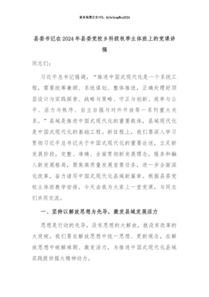 【七哥公文】2024年:县委书记在2024年县委党校乡科级秋季主体班上的党课讲稿+更多免费公文+VX:QiGeGongWen2024