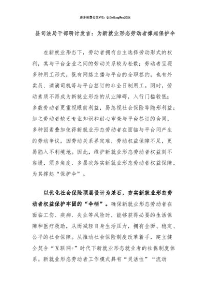 【七哥公文】2024年:县司法局干部研讨发言:为新就业形态劳动者撑起保护伞+更多免费公文+VX:QiGeGongWen2024