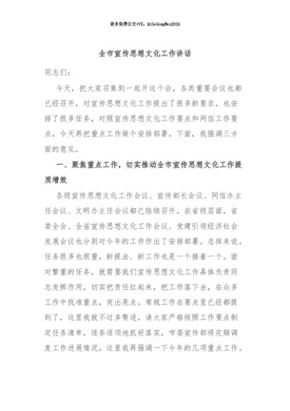 / 【七哥公文】2024年:全市宣传思想文化工作讲话+更多免费公文+VX:QiGeGongWen2024