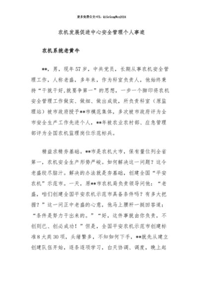 / 【七哥公文】2024年:农机发展促进中心安全管理个人事迹+更多免费公文+VX:QiGeGongWen2024