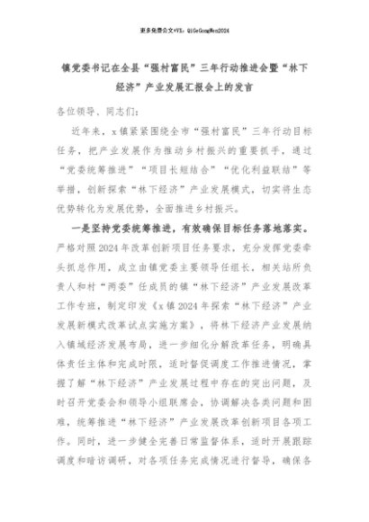【七哥公文】2024年:镇党委书记在全县“强村富民”三年行动推进会暨“林下经济”产业发展汇报会上的发言+更多免费公文+VX:QiGeGongWen2024