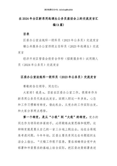 【七哥公文】2024年:(4篇)在2024年全区新录用选调生公务员座谈会上的交流发言汇编+更多免费公文+VX:QiGeGongWen2024