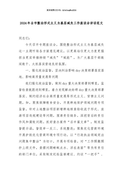 【七哥公文】2024年:2024年全市整治形式主义为基层减负工作座谈会讲话范文+更多免费公文+VX:QiGeGongWen2024