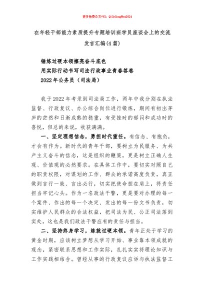 【七哥公文】2024年:(4篇)在年轻干部能力素质提升专题培训班学员座谈会上的交流发言汇编+更多免费公文+VX:QiGeGongWen2024