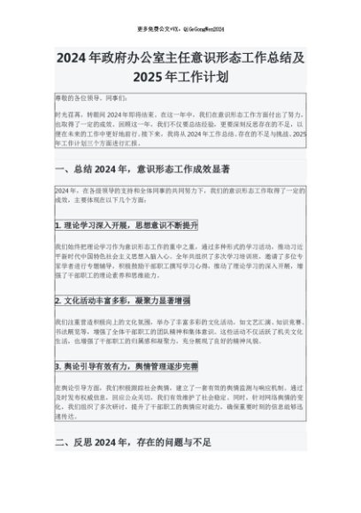 【七哥公文】2024年:2024年政府办公室主任意识形态工作总结及2025年工作计划+更多免费公文+VX:QiGeGongWen2024