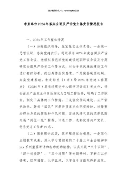 【七哥公文】2024年:市直单位2024年落实全面从严治党主体责任情况报告+更多免费公文+VX:QiGeGongWen2024