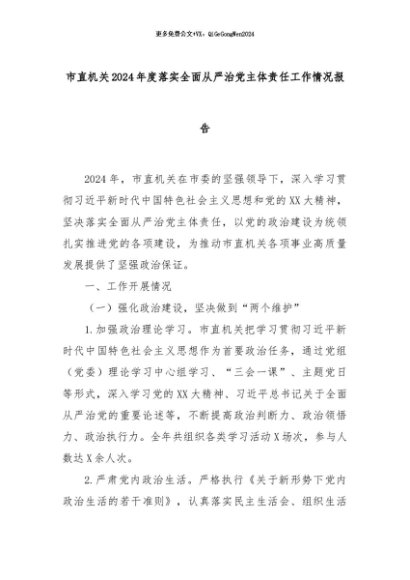 【七哥公文】2024年:市直机关2024年度落实全面从严治党主体责任工作情况报告+更多免费公文+VX:QiGeGongWen2024