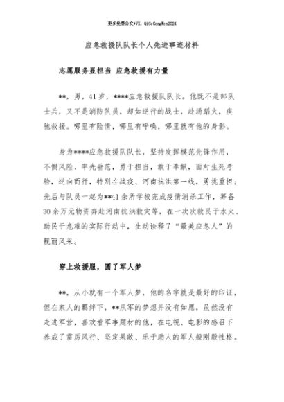 / 【七哥公文】2024年:应急救援队队长个人先进事迹材料+更多免费公文+VX:QiGeGongWen2024