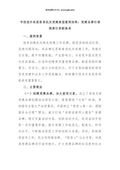 【七哥公文】2024年:市促进外来投资局机关党建典型案例材料:党建品牌引领招商引资新格局+更多免费公文+VX:QiGeGongWen2024