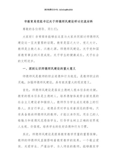 / 【七哥公文】2024年:市教育局党组书记关于师德师风建设研讨交流材料+更多免费公文+VX:QiGeGongWen2024