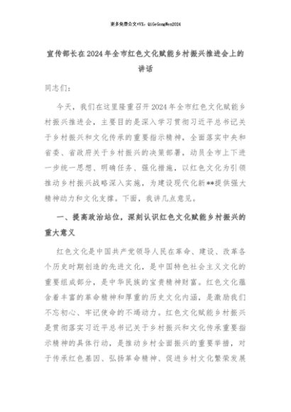 【七哥公文】2024年:宣传部长在2024年全市红色文化赋能乡村振兴推进会上的讲话+更多免费公文+VX:QiGeGongWen2024