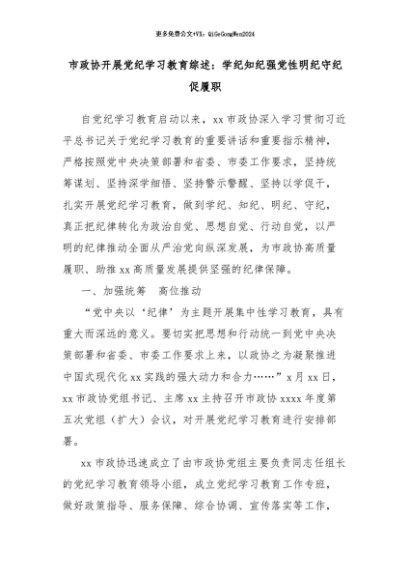 【七哥公文】2024年:市政协开展党纪学习教育综述:学纪知纪强党性明纪守纪促履职+更多免费公文+VX:QiGeGongWen2024