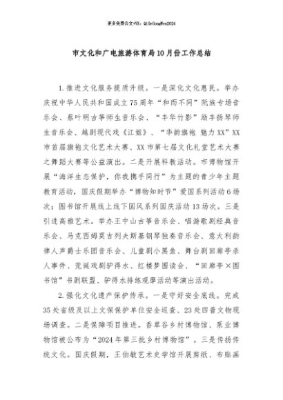 / 【七哥公文】2024年:市文化和广电旅游体育局10月份工作总结+更多免费公文+VX:QiGeGongWen2024