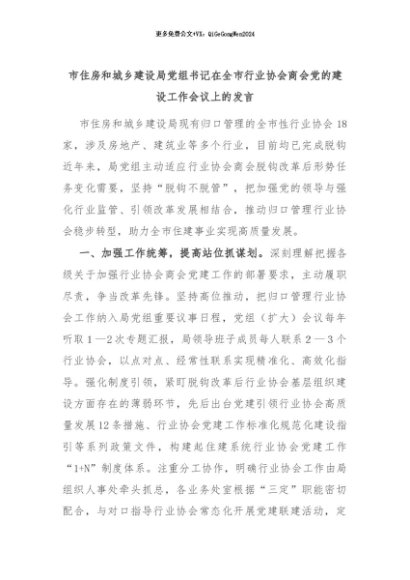 【七哥公文】2024年:市住房和城乡建设局党组书记在全市行业协会商会党的建设工作会议上的发言+更多免费公文+VX:QiGeGongWen2024