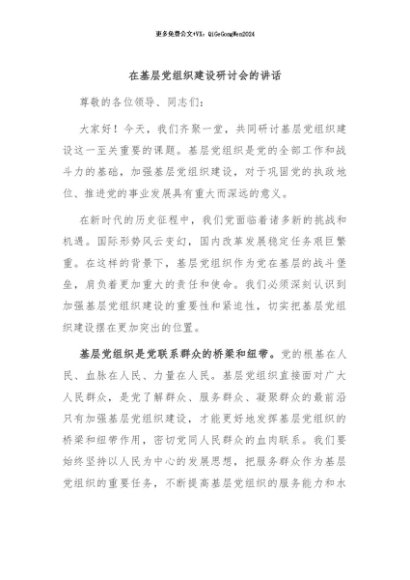 / 【七哥公文】2024年:在基层党组织建设研讨会的讲话+更多免费公文+VX:QiGeGongWen2024