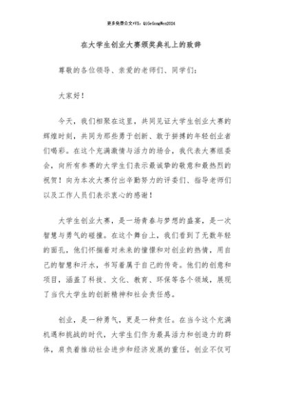 / 【七哥公文】2024年:在大学生创业大赛颁奖典礼上的致辞+更多免费公文+VX:QiGeGongWen2024